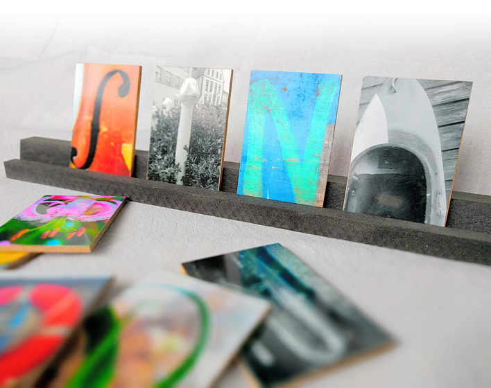 Holz-Steckleiste werden unsere Fotobuchstaben zum Hingucker. Die Maße von 5 x 7.5cm sind übrigens